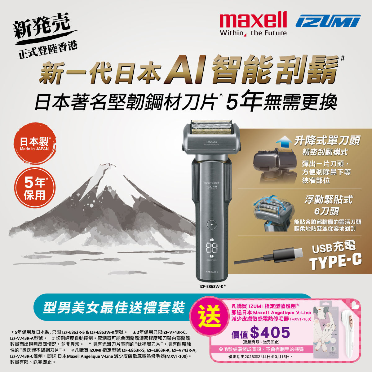 [送禮套裝] Maxell IZUMI IZF-E863W-K everadge IZUMI Premium 系列 6刀片AI智能感應技術電鬚刨 (黑鎳色) (送日本 Maxell Angelique V-Line 減少皮膚敏感電熱修毛器 MXVT-100)